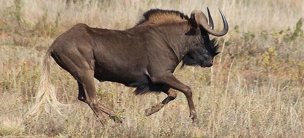对于初次接触狩猎者,捕猎蓝角马看起来相对容易。因为在广阔的平原,我们会经常和蓝角马遭遇,狩猎者也很容易找到它们的踪迹。但事实是,要接近蓝角马,并非想象中的那么容易。黑角马对周围的危险有非常出色的感知能力,在黑角马群受到威胁时它们会一哄而起,快速逃离。黑角马属于羚羊类,但它们长有不同寻常的角,胡须和鼻毛,这让它们看起来更像是公牛。黑角马的皮毛一般呈深咖啡色,尾巴呈白色的马尾状,所以人们称它为角马。又名白尾羚。